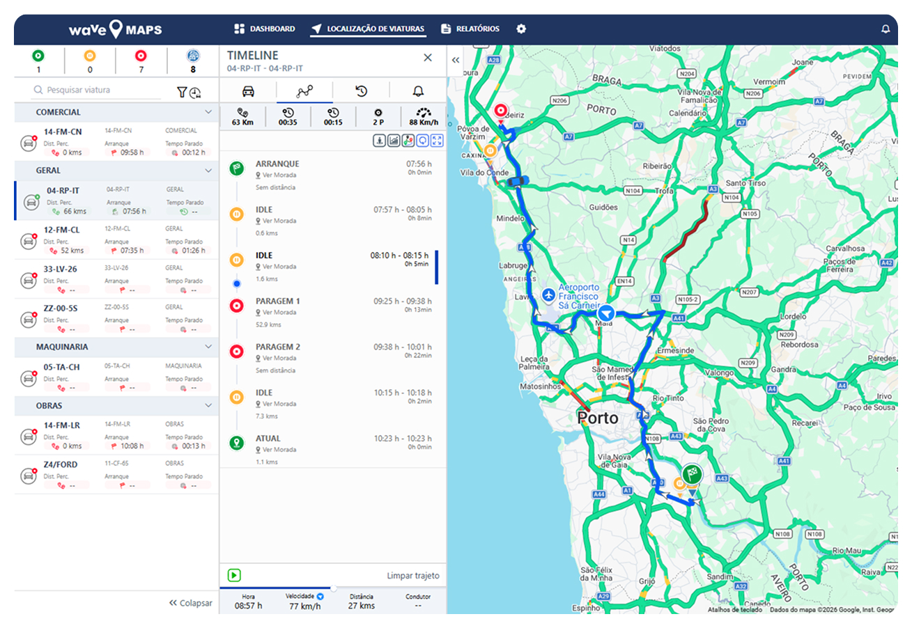 Acompanhe em tempo real a localização das viaturas & máquinas e aceda a informações detalhadas sobre cada um.
