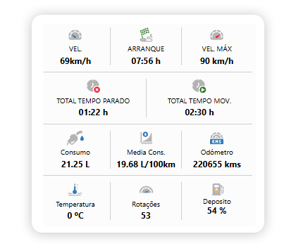 Registo de percurso com circulação e paragens, monitorização de consumo, desempenho do veículo e condições ambientais.