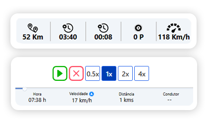 Reveja cada percurso e visualize, a cada momento, a distância percorrida e a velocidade do veículo. Verifique todas as etapas da viagem, incluindo momentos de arranque, paragens, deslocações e variações de velocidade.