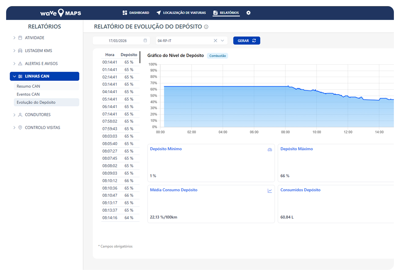 - Relatórios de atividade (Viagens, Diário, Uso Indevido & Ralenti)